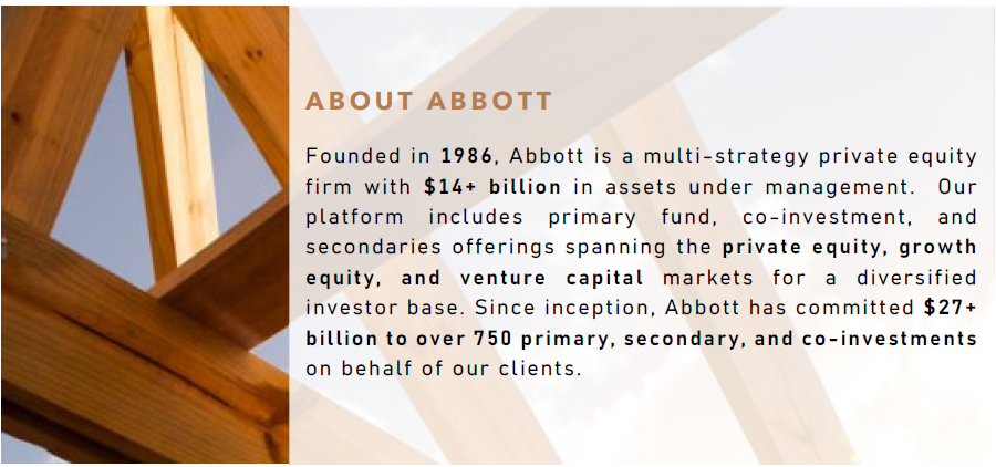 This material is for informational purposes only and is not an offer or a solicitation to subscribe to any fund and does not constitute investment, legal, regulatory, business, tax, financial, accounting or other advice or a recommendation regarding any securities of Abbott, of any fund or vehicle managed by Abbott, or of any other issuer of securities. No representation or warranty, express or implied, is given as to the accuracy, fairness, correctness or completeness of third party sourced data or opinions contained herein and no liability (in negligence or otherwise) is accepted by Abbott for any loss howsoever arising, directly or indirectly, from any use of this document or its contents, or otherwise arising in connection with the provision of such third-party data.