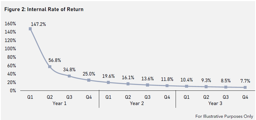 For example, buying an LP position for 80 cents on the dollar leads to an immediate uplift in value to 1.25x in the first quarter after closing (100/80) and a correspondingly high 147.2% first-quarter IRR. However, as time passes, without liquidity, the initial discount-driven “pop” in IRR will quickly evaporate. Figure 2 below shows how (all other things remaining equal and no interim liquidity) the initially high IRR drops to below 8% within just three years due to the exponential decay of the IRR over time.