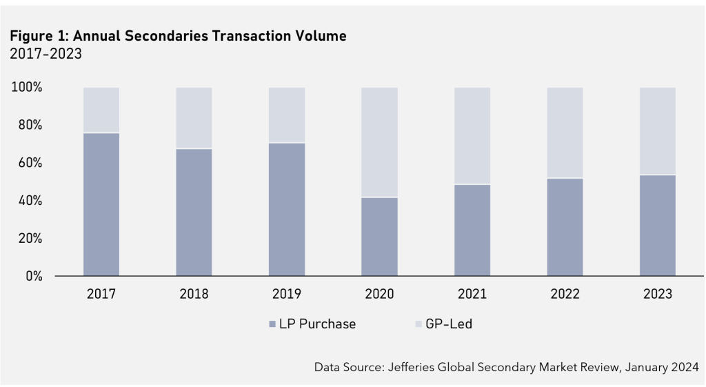 These transactions are frequently referred to as LP-led or LP purchases and, for the three years prior to 2020, accounted for roughly 70% of all secondary transaction volume each year. From 2021-2023, LP purchases have accounted for ~50% of the total market as GP-led transactions have become more popular (see Figure 1).