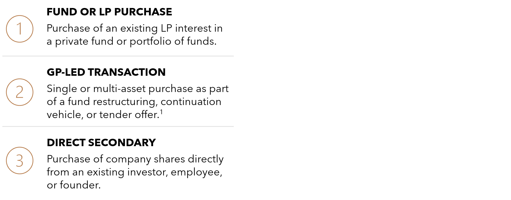 At the most basic level, secondaries transactions involve the purchase and sale of existing positions in private equity and venture capital funds or companies. There are various types of secondaries transactions and structures, but most often, they fall into one of three categories.